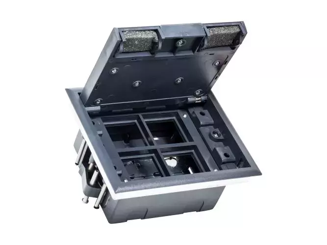 Стальной люк в пол на 4 поста от Ecoplast используется для компактного размещения интерфейсов подключения слаботочных и силовых сетей без привязки к стенам — в помещениях с открытой планировкой. Благодаря суппортам с поддержкой быстрой установки и снятия модулей стандартного размера 45х45 узлы, построенные на люках такого типа, сравнительно легко переоборудовать по мере изменения требований к их комплектации.