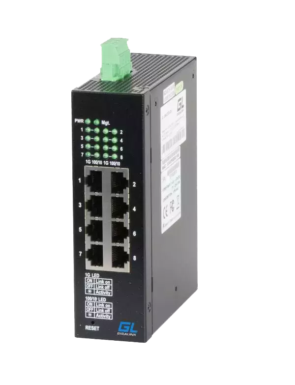 L2 управляемый, индустриальный на DIN рейку, 8 x 10/100/1000 BaseT, питание 12В (блок питания поставляется отдельно 20 Ватт)