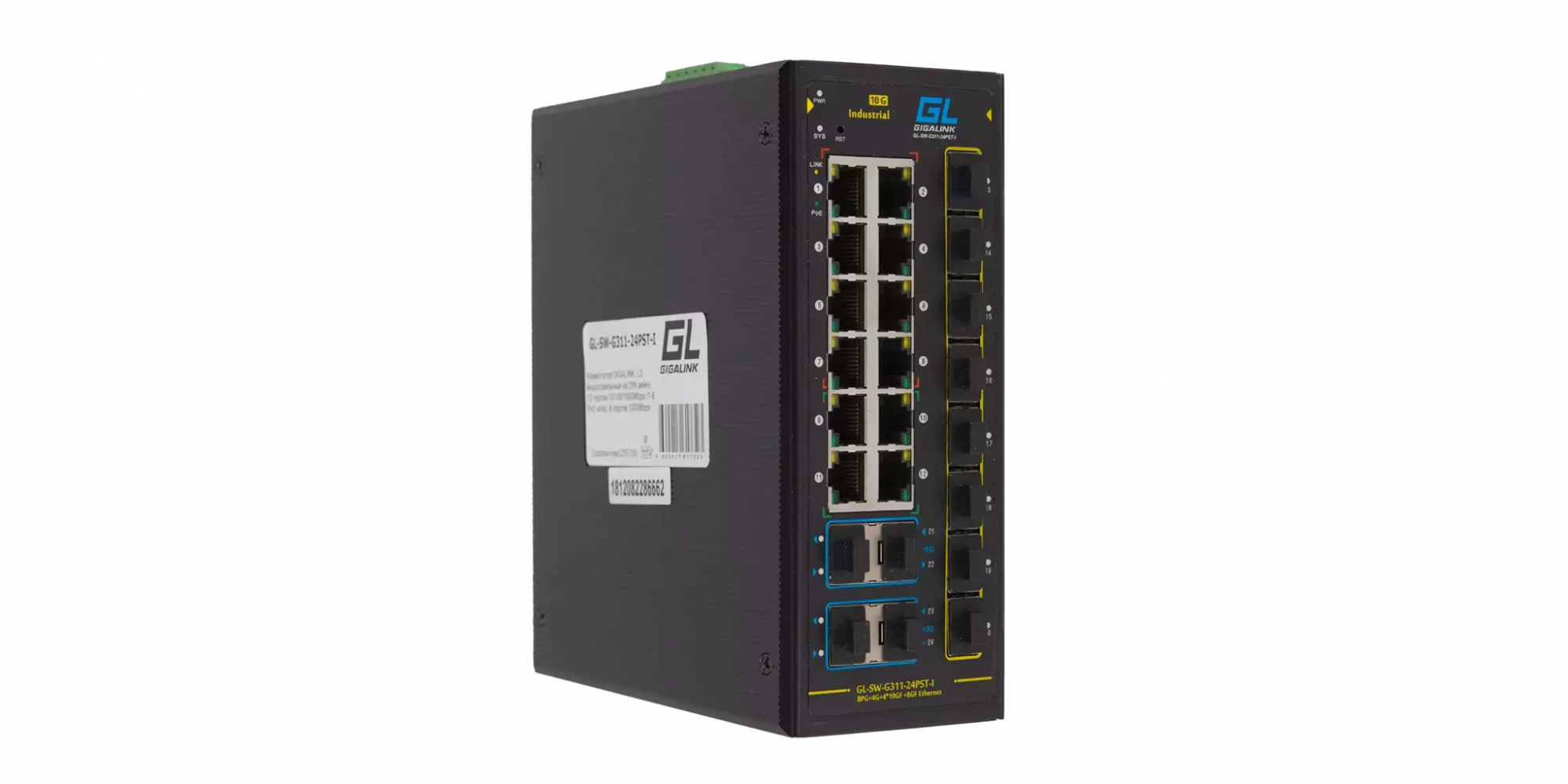 Коммутатор GIGALINK, L3, индустриальный на DIN рейку, 12x10/100/1000Мбит/с (1-8 PoE af/at), 8x1000Мбит/с SFP, 4x10Гбит/с SFP+, 1 Консольный RJ-45, питание 48В (блок питания поставляется отдельно 480 Ватт)
