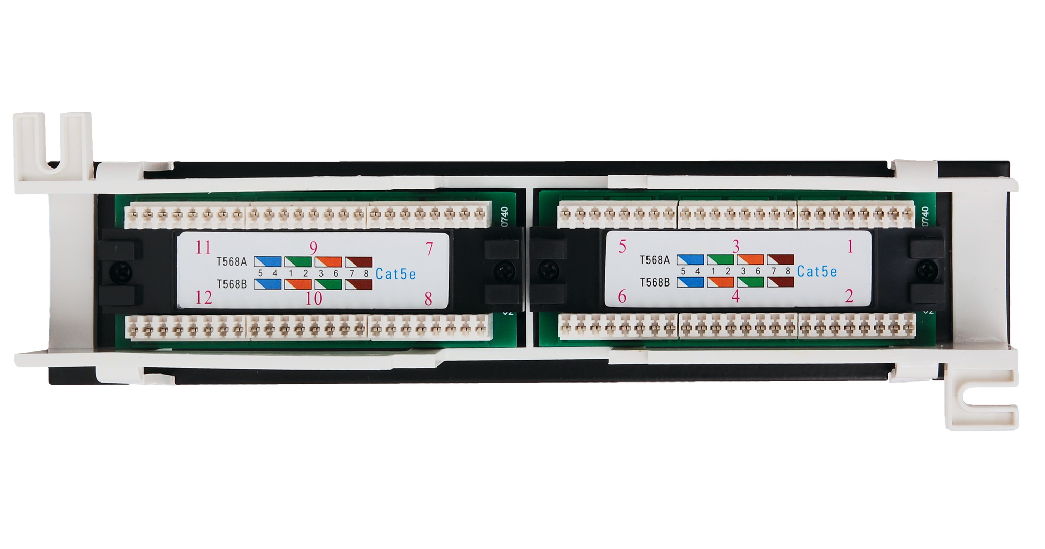 Патч-панель EC-UWP-12-UD2 предназначена для настенного монтажа без дополнительных кронштейнов, имеет 12 портов RJ45/8P8C категории 5е. Площадка для настенного монтажа съемная, что позволяет легко демонтировать панель, не откручивая ее от стены. Патч-панель выполнена в классическом черном цвете имеет универсальные контакты 110/KRONE с цветовой маркировкой по стандарту T568A/B с тыльной стороны. Для удобства администрирования, все порты пронумерованы, а также на патч-панелях имеются дополнительные маркировочные площадки.